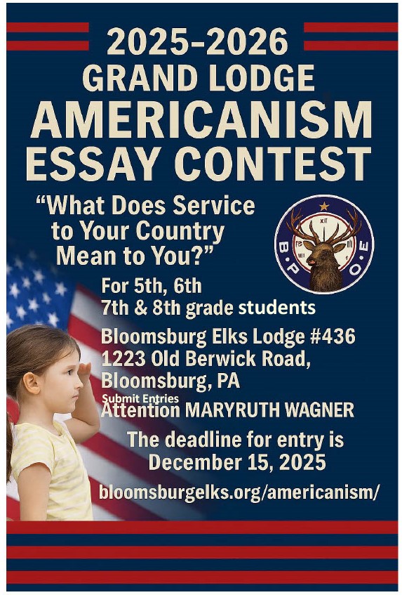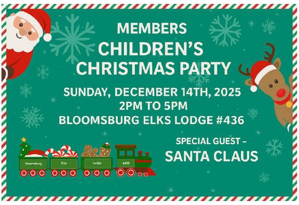 Bloomsburg Elks Home Association Meeting Dear Members, You are invited to attend the Bloomsburg Elks Home Association Meeting on Tuesday, December 9th, 2025 at 7:00 PM at the Lodge. This […] |