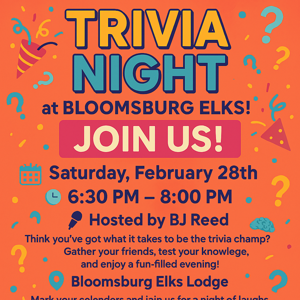 🎉 TRIVIA NIGHT at Bloomsburg Elks! 🎉 JOIN US! 📅 Saturday, February 28th 🕡 6:30 PM – 8:00 PM 🎤 Hosted by BJ Reed Think you’ve got what it takes to be the trivia champ? 🧠 Gather your friends, test your knowledge, and enjoy a fun-filled evening! 📍 Bloomsburg Elks Lodge 👉 Mark your calendars […] |