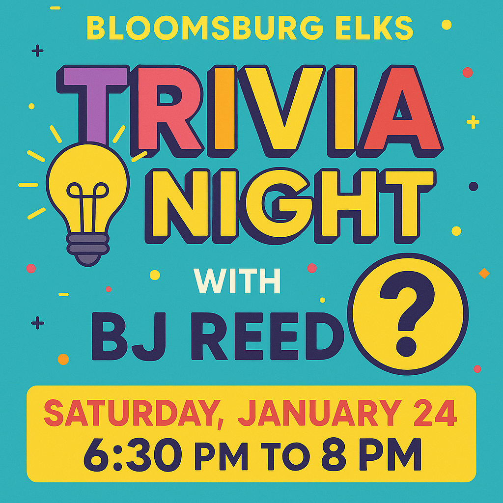 🎉 TRIVIA NIGHT at Bloomsburg Elks! 🎉 📅 Saturday, January 24th 🕡 6:30 PM – 8:00 PM 🎤 Hosted by BJ Reed Think you’ve got what it takes to be the trivia champ? 🧠 Gather your friends, test your knowledge, and enjoy a fun-filled evening! 📍 Bloomsburg Elks Lodge 👉 Mark your calendars and join […] |